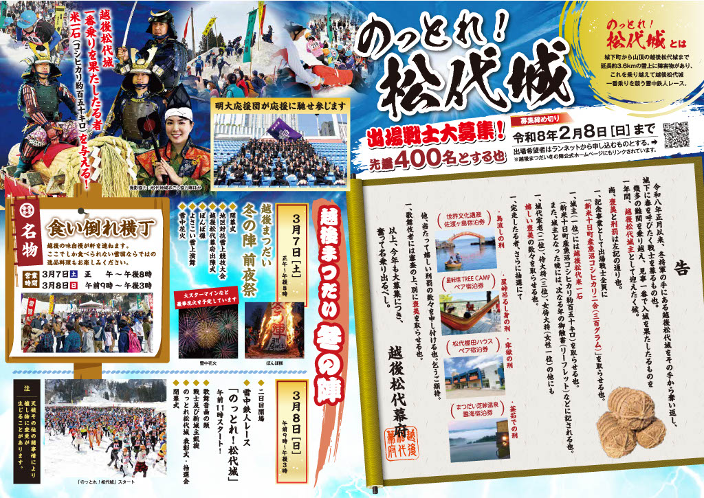 新市誕生20周年記念 第36回『越後まつだい冬の陣』のっとれ!松代城エントリー受付開始いたしました。